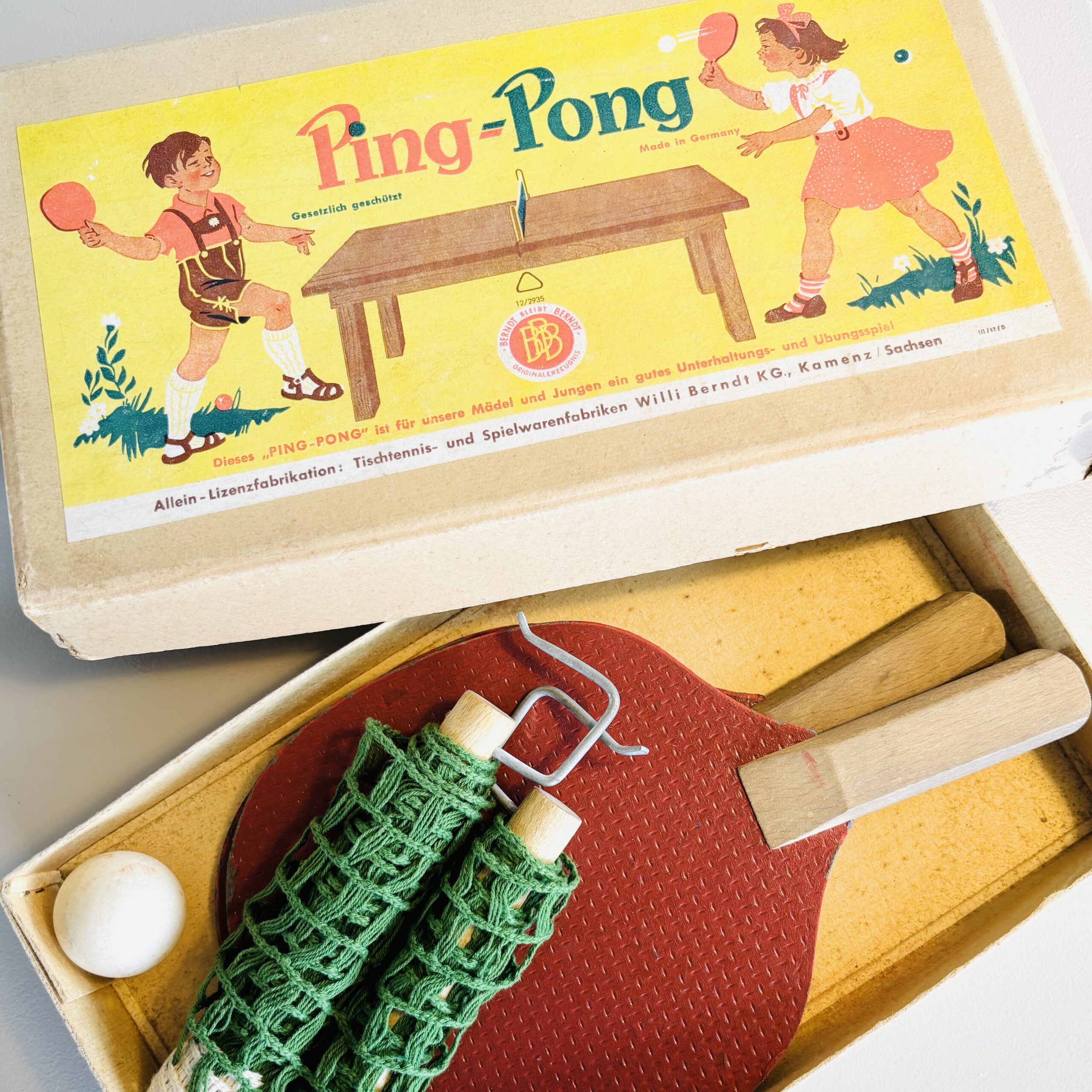 Nostalgisk gammelt tysk bordtennis sæt. Med hæklet net. Lige til at sætte op og begynde at spille.