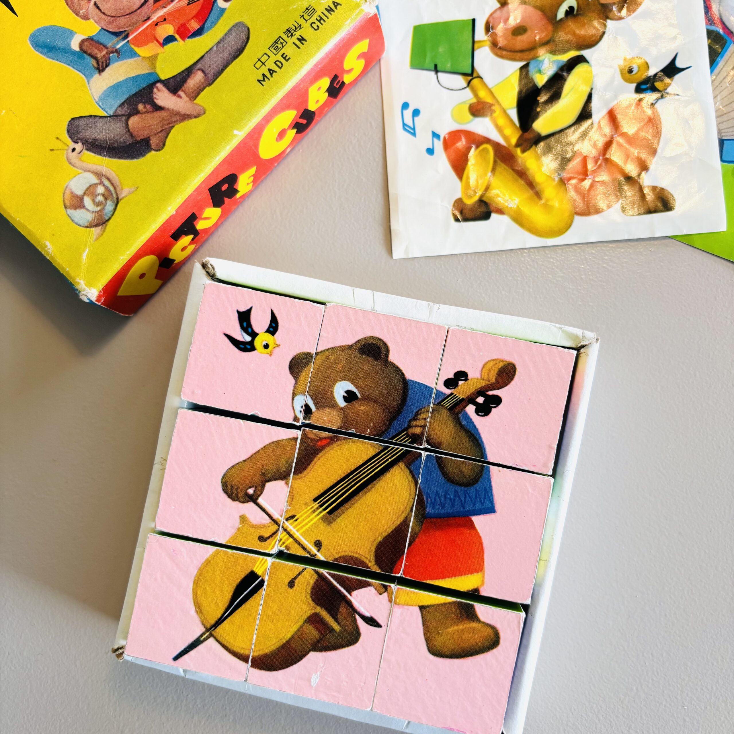 Sød gammel vende spil med billedterninger med den helt rigtige patina.